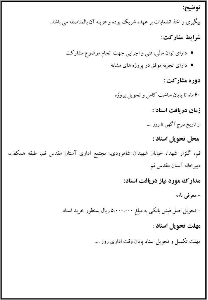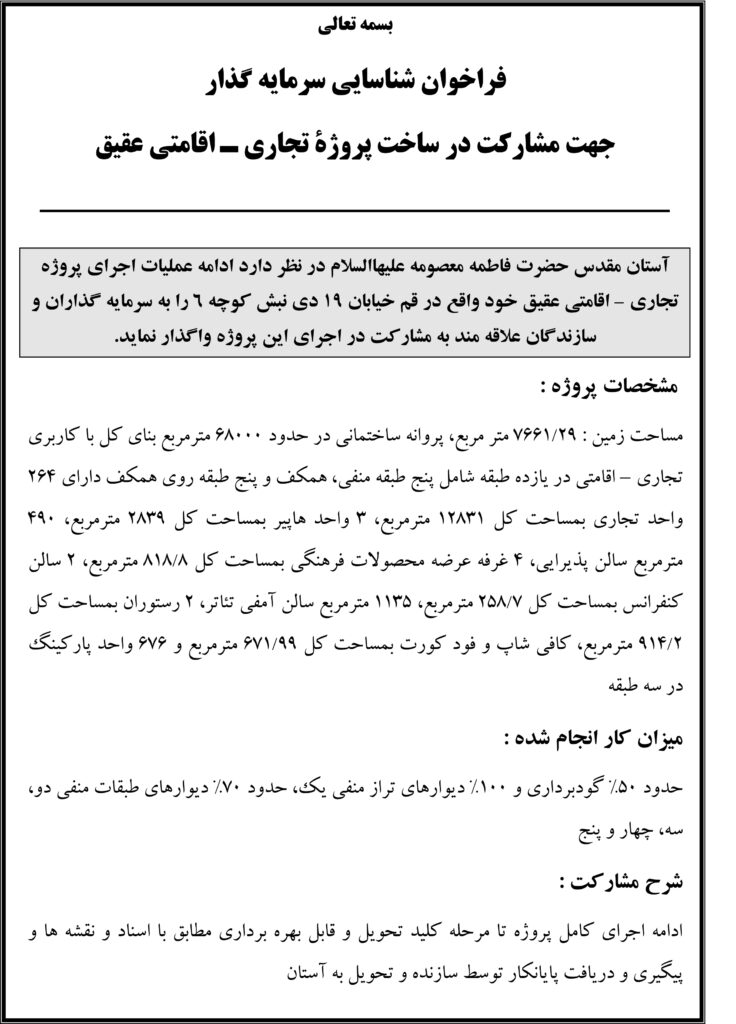 آگهی فراخوان مشارکت و سرمایه گذاری در ساخت و تکمیل پروژۀ تجاری ـ اقامتی (عقیق) متعلق به آستان مقدس حضرت فاطمه معصومه علیها السلام به آدرس: قم – خیابان ۱۹ دی نبش کوچه ۶